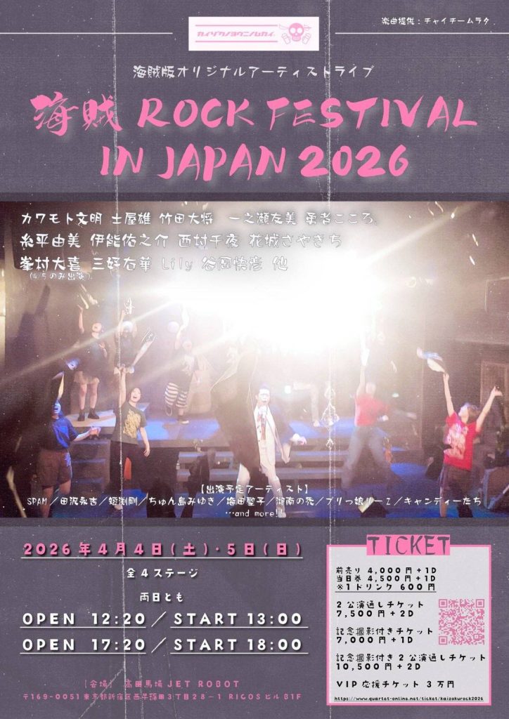 4/4(土)、4/5(日)、海賊のように飲む会「海賊 ROCK FESTIVAL IN JAPAN 2026 」にアーティストとして出演します。