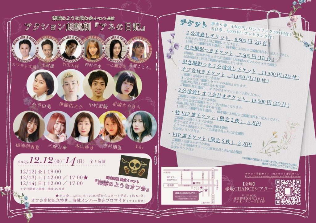 12/12(金)~12/14(日)に行われる、海賊のように飲む会 イベント公演 アクション朗読劇「アネの日記」に出演します。